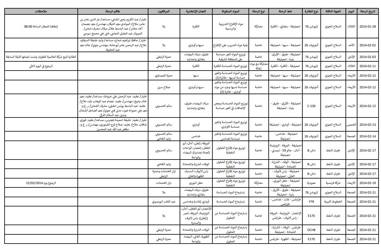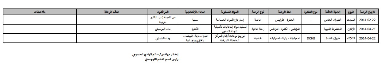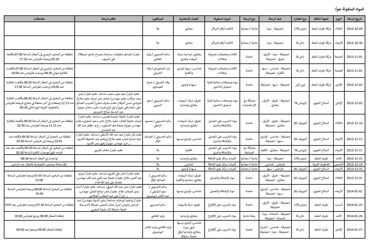 قام قسم الدعم اللوجستي بالإشراف بنفسه على عمليات توزيع المواد عليها إما بالجو أو بالبر. ففي انتخابات المؤتمر الوطني 2012، فتم نقل المواد الانتخابية لمكاتب الإدارة الانتخابية عن طريق طائرات النقل العسكري التابعة للقوات الجوية الليبية. وفي انتخابات الهيئة التأسيسية فبراير 2014 فتم النقل عن طريق طائرات النقل العسكري وكذلك طائرات شركة طيران النفط إلى كل من قاعدة بنينا الجوية وقاعدة الأبرق ومطار طبرق ومطاري سبها وأوباري وكذلك مطار غدامس. والجدول التالي يوضح عدد الرحلات الجوية وتفاصيلها في انتخابات الهيئة التأسيسية.