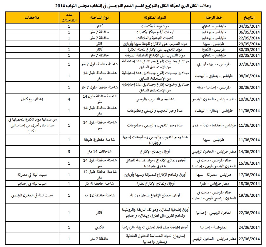 أما في انتخابات البرلمان يونيو 2014 فكان الوضع يختلف، فقد تم نقل كل مواد المنطقة الشرقية والجنوبية عن طريق الشاحنات براً، والجدول التالي يوضح عدد الرحلات بواسطة الشاحنات: