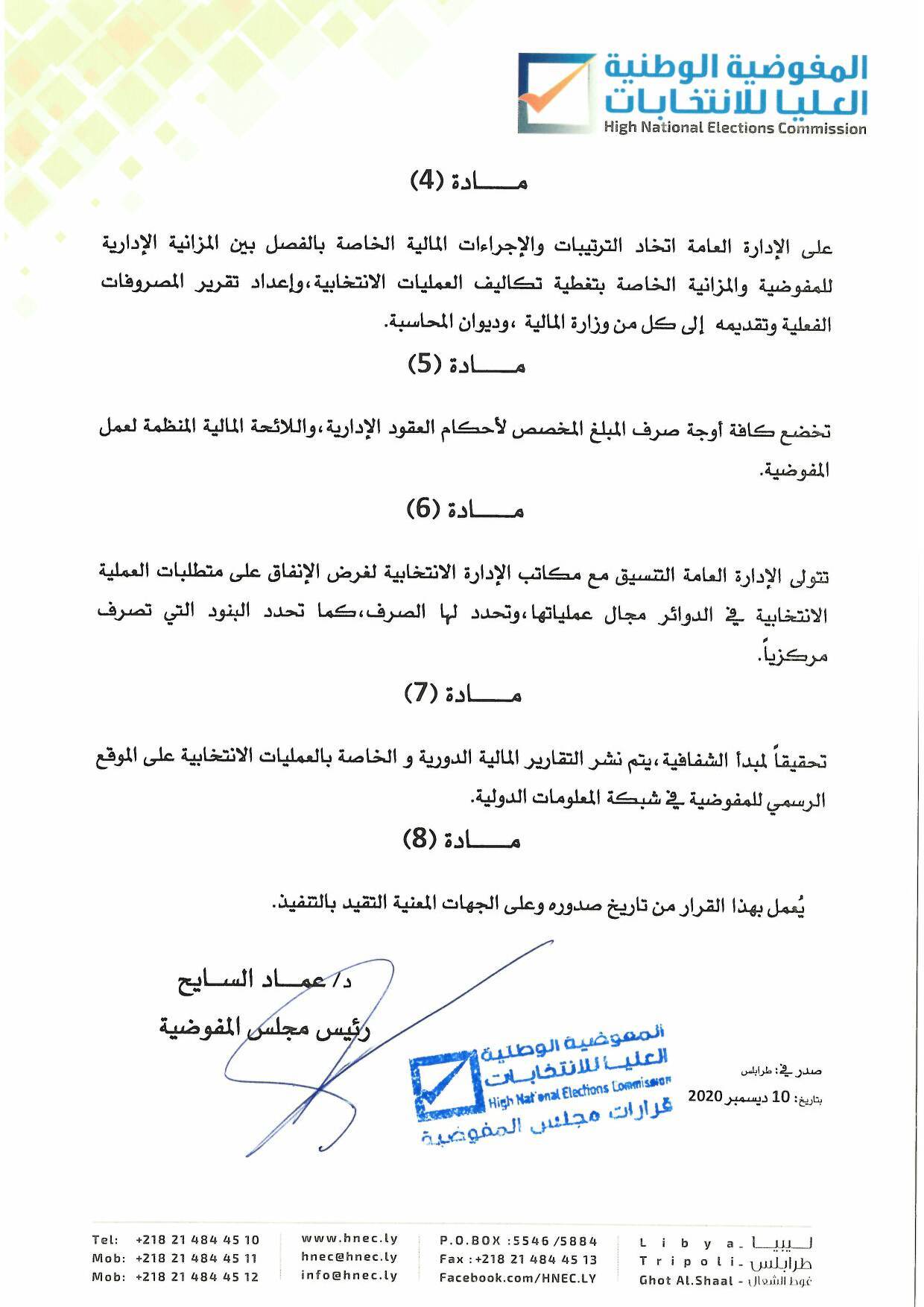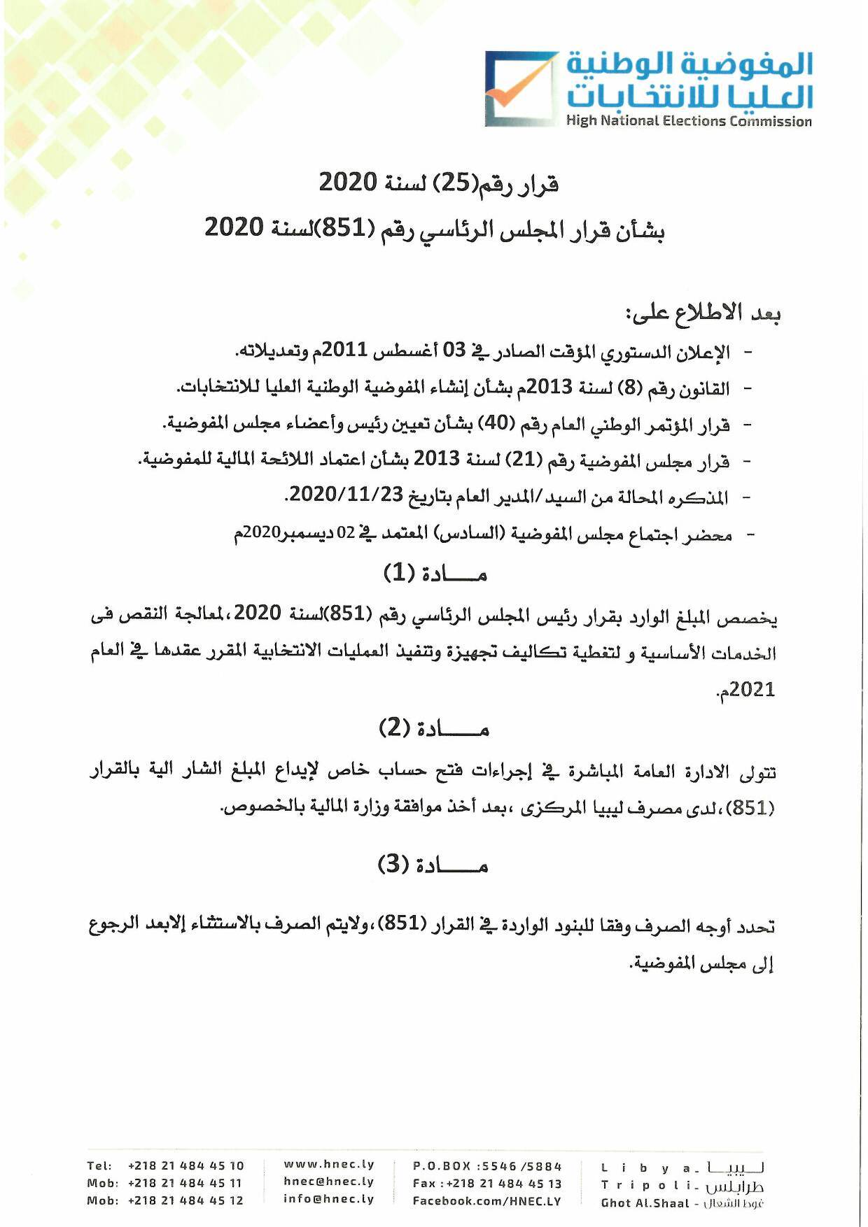 أصدر رئيس مجلس المفوضية الوطنية العليا للانتخابات الدكتور عماد السائح القرار رقم (25 ) لسنة 2020 م بشأن تحديد آليات تنفيذ قرار المجلس الرئاسي رقم (851 )