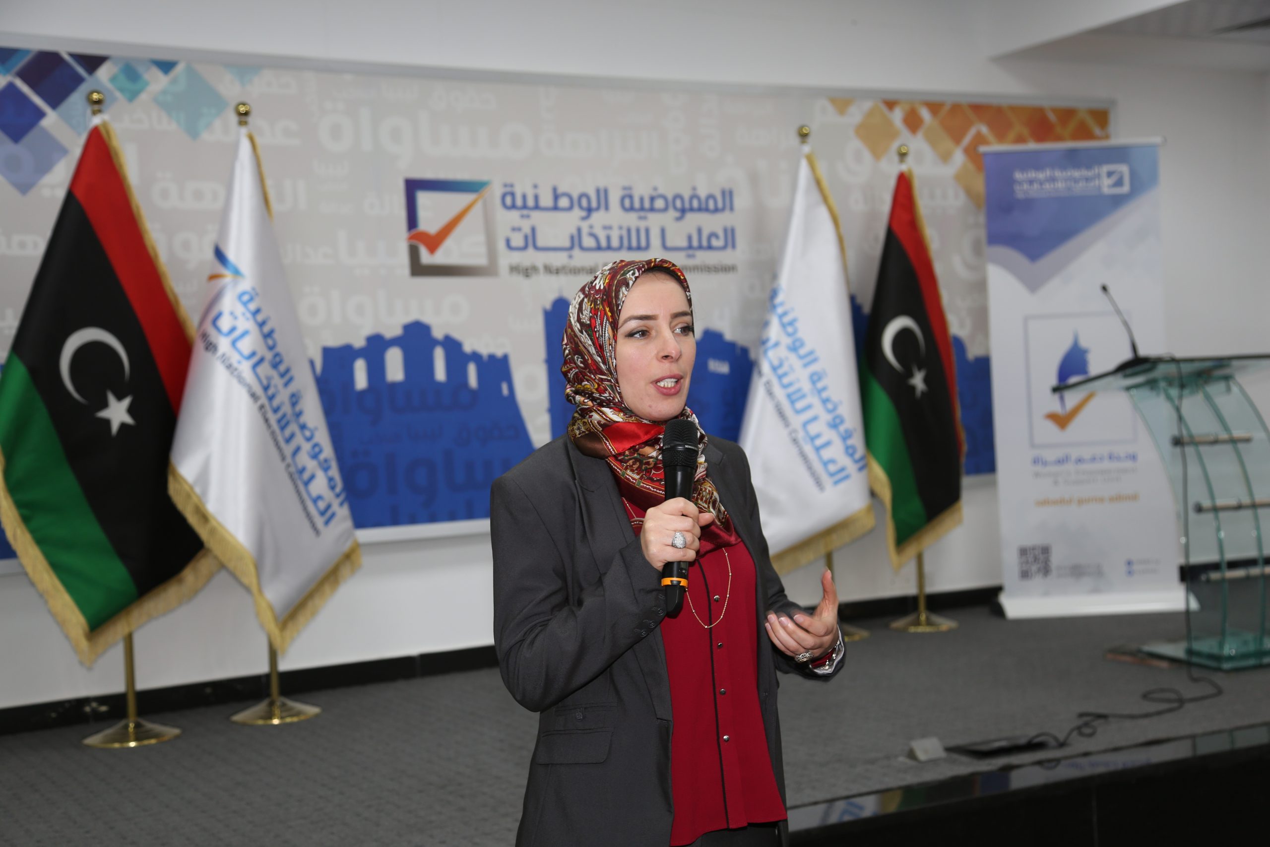 وتحدثت السيدة حليمة بالحاج مدير منظمة أيفس فرع ليبيا عن الدور الذي اضطلعت به المنظمة كشريك للمفوضية، في دعم النساء الليبيات للوصول إلى صناديق الاقتراع عن طريق دعم برامج التوعية وتوفير برامج التدريب، ودعت في كلمتها إلى السعي لإحداث التغيير الاجتماعي الذي بدوره يحقق على المدى الطويل ثقافة المشاركة الفاعلة للمرأة ونيل حقوقها السياسية.