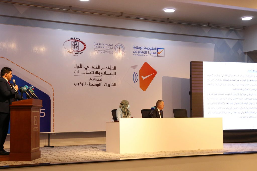 كما شهدت فعاليات الجلسة الأولى عرضاً توضيحا للخبيرة الإعلامية من منظمة أيفس السيدة شانتال سركيس، تناولت فيه المعايير الدولية والتجارب العالمية للتغطية الإعلامية للانتخابات ودور الإعلام في إجراء انتخابات تتسم بالحرية والنزاهة. ويتوالى حالياً عرض الورقات حيث تقدم الدكتورة سليمة حسن زيدان ورقة حول أداء وسائل الإعلام خلال الانتخابات في ليبيا، وهي تقييم للتجربة الانتخابية الليبية بعد العام 2011م