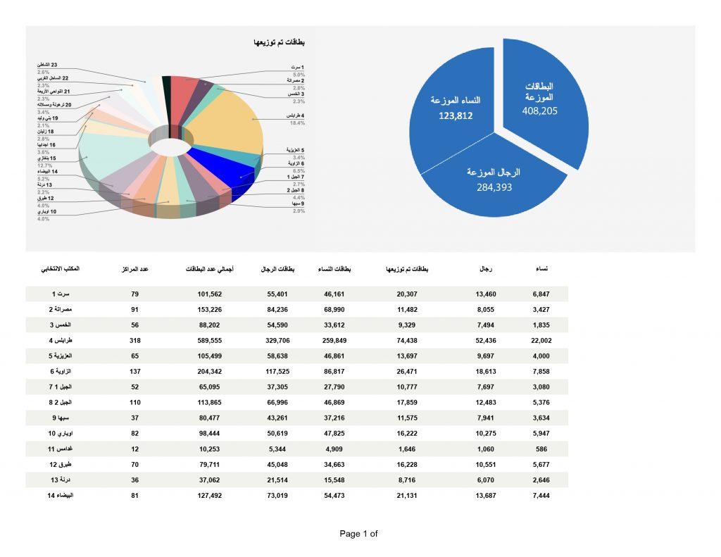 أفادت غرفة العمليات الرئيسية بالمفوضية الوطنية العليا للانتخابات بأن مراكز توزيع بطاقة الناخب التابعة لمكاتب الإدارة الانتخابية وزعت عدد (408205) بطاقة ناخب، بلغ عدد المتحصلين عليها من الرجال (284393)، في حين بلغ عدد النساء (123812)، وذلك بحسب الإحصائية الصادرة اليوم الأحد الموافق 14 نوفمبر الجاري.