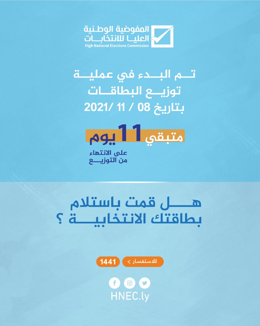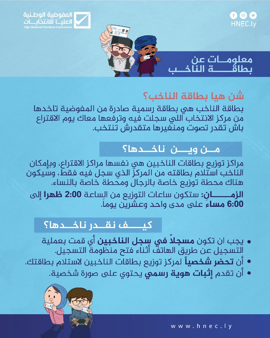 وتهيب بالناخبين الذين لم يستلموا بطاقاتهم حتى الآن ضرورة التوجه إلى مراكز الانتخاب التي سجلوا بها لاستلام بطاقاتهم واللحاق بركب المشاركة، حتى يتمكنوا من الإدلاء بأصواتهم في الانتخابات القادمة.