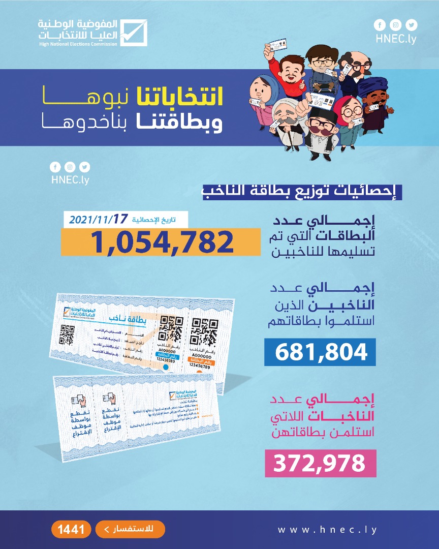 احتفل موظفو المفوضية الوطنية العليا للانتخابات بتخطي حاجز المليون ناخب ممن استلموا بطاقاتهم الانتخابية، حيث سجلت الإحصائيات الواردة من المراكز الانتخابية اليوم الأربعاء 17 نوفمبر 2021م، في تمام الساعة الرابعة مساء وصول عدد البطاقات التي تم تسليمها ما يزيد على مليون بطاقة.