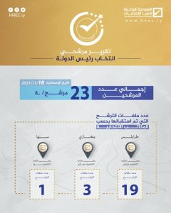 وبهذا يصبح العدد الكلي لأعداد المرشحين (23) مرشحاً، وتجدر الإشارة إلى أن قبول الملفات يُعد قبولاً مبدئياً، وسوف تحيل المفوضية ملفات المتقدمين للترشح إلى كل من النائب العام، وجهاز المباحث الجنائية، والإدارة العامة للجوازات والجنسية، وذلك عملاً بالقانون رقم (1) لسنة 2021 بشأن انتخاب رئيس الدولة، للفصل في مدى مطابقة بياناتهم للشروط المحددة في القانون. وعقب ذلك سوف تعلن المفوضية عن القوائم الأولية بوسائل الإعلام وموقعها الرسمي.
