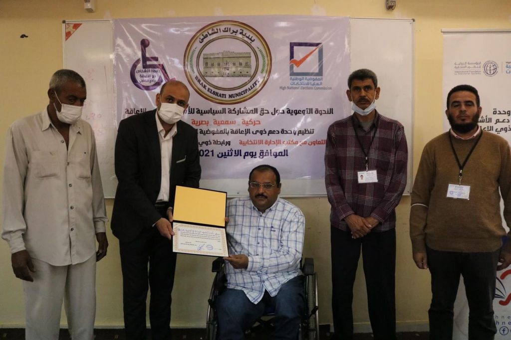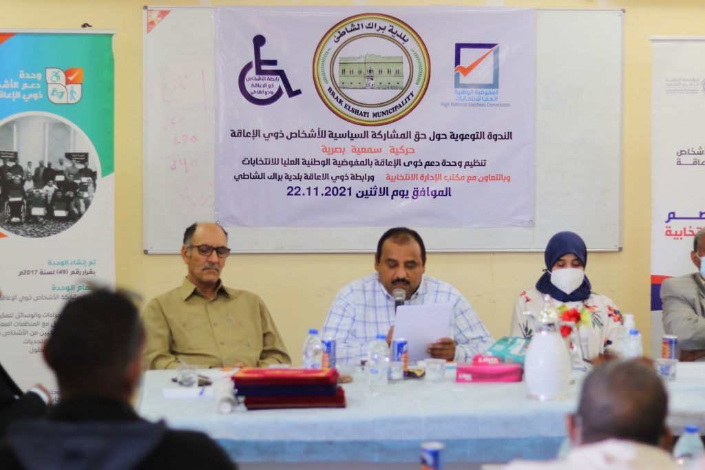 نظّمت وحدة دعم الأشخاص ذوي الإعاقة بالمفوضية الوطنية العليا للانتخابات أمس الاثنين 22 نوفمبر2021م، بالتنسيق  مع مكتب الادارة الانتخابية  براك الشاطئ والرابطة العامة للأشخاص ذوي الاعاقة  براك الشاطئ، وبالتعاون مع (IFES Libya) المنظمة الدولية للنظم الانتخابية، جلسة توعية حول حق المشاركة السياسية للأشخاص ذوي والاعاقة، وذلك بمكتبة كلية العلوم الهندسية و التقنية بالمدينة.