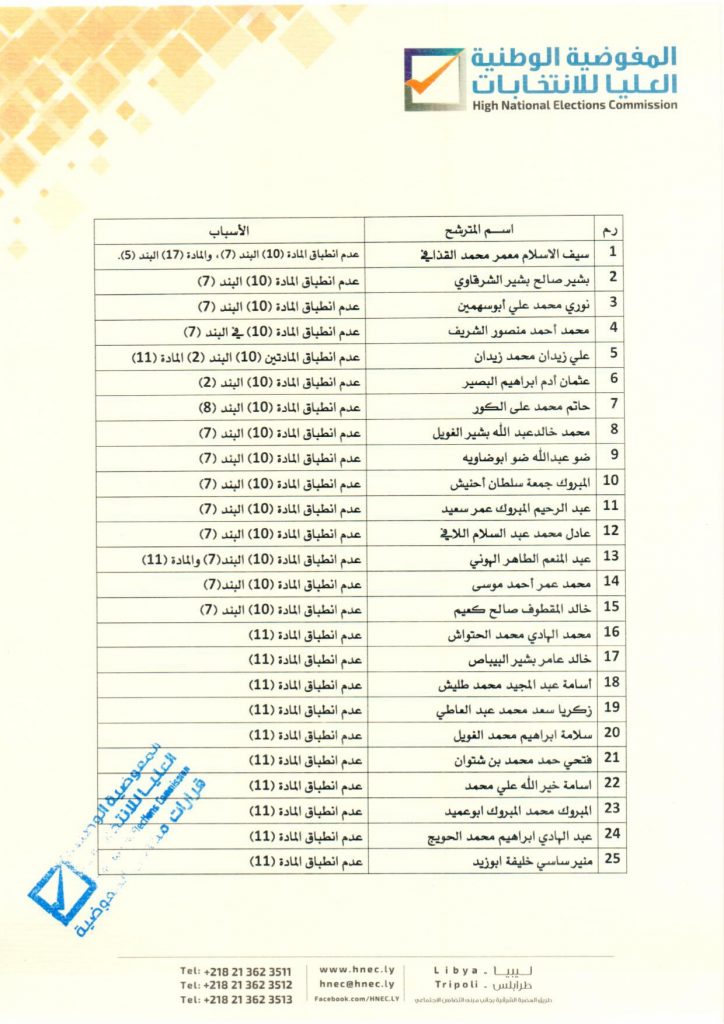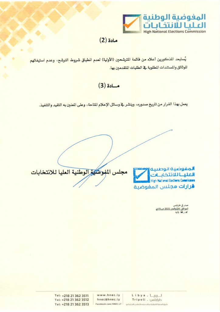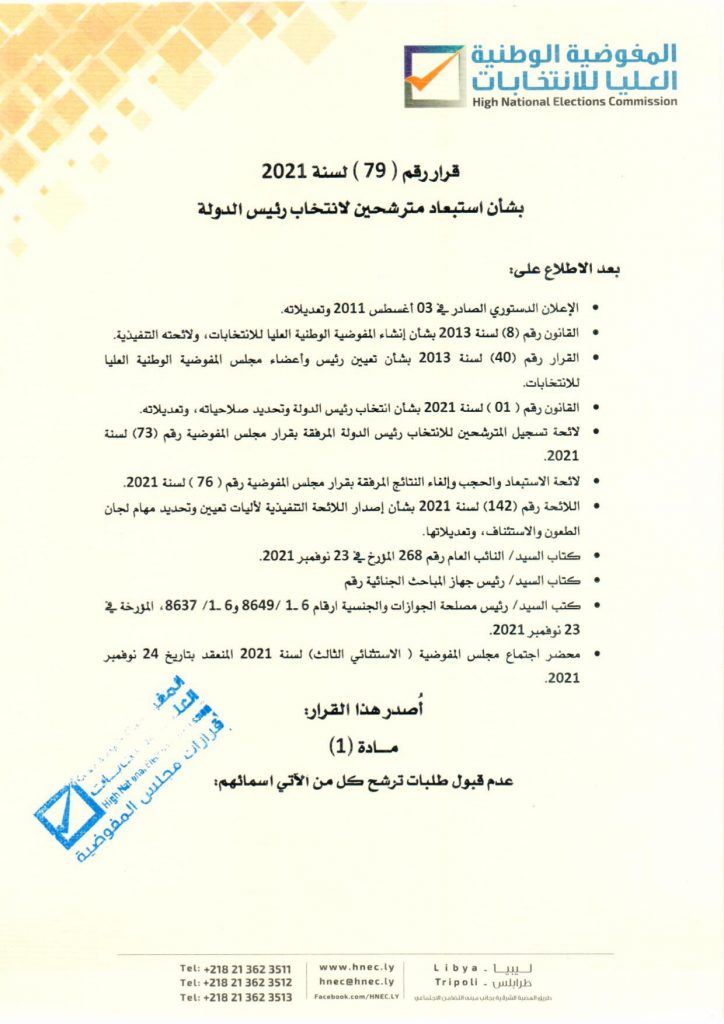 أصدر مجلس المفوضية الوطنية العليا للانتخابات اليوم الأربعاء 24 نوفمبر 2021م، القرار رقم (79) بشأن استبعاد (25) مترشحاً لا تنطبق عليهم شروط الترشح للانتخابات الرئاسية بحسب ما جاء في ردود كل من النائب العام ورئيس جهاز المباحث الجنائية ورئيس مصلحة الجوازات والجنسية، استنادا إلى مواد القانون رقم (1) لسنة 2021م، بشأن انتخاب رئيس الدولة. وبينت ردود الجهات المختصة المواد التي تعارضت مع بيانات المترشحين قرين كل اسم.