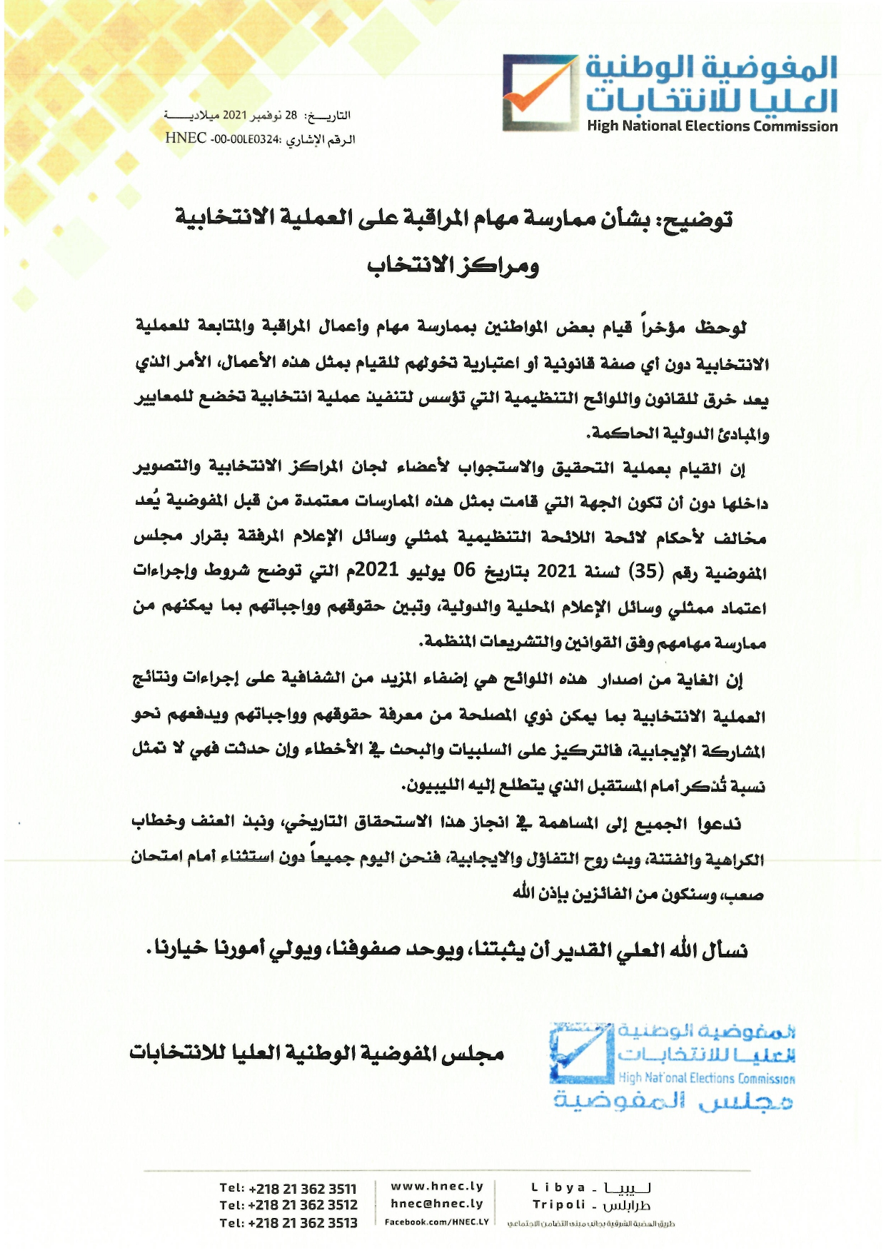 مجلس المفوضية يصدر توضيحاً بشأن ممارسة مهام المراقبة على العملية الانتخابية ومراكز الانتخاب