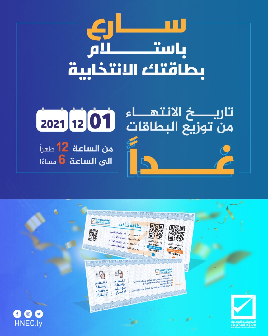 المفوضية الوطنية العليا للانتخابات وهي تعلن عن ان يوم غدٍ الأربعاء 1 ديسمبر 2021م هو اخر أيام المدة المحددة لاستلام بطاقة الناخب .. تهنئ من بادروا باستلام بطاقاتهم، تثمن كل الجهود المبذولة من قبل العاملين في مراكز التوزيع، وشركائها في انجاز العملية الانتخابية الذين تظافرت جهودهم من أجل تسليم بطاقة الناخب في انسب الظروف، تهيب بالمواطنين ان يعو اهمية استلامهم لبطاقاتهم الانتخابية فبدونها لن يستطيعوا المشاركة في الاستحقاق الانتخابي المقرر في 24 ديسمبر، وتؤكد ان هذه الوثيقة الرسمية تحفظ هذا الحق في كل الاستحقاقات الانتخابية القادمة فبوجود QR تصبح هذه البطاقة دائمة ومتضمنة لكل معلومات الناخب الشخصية.