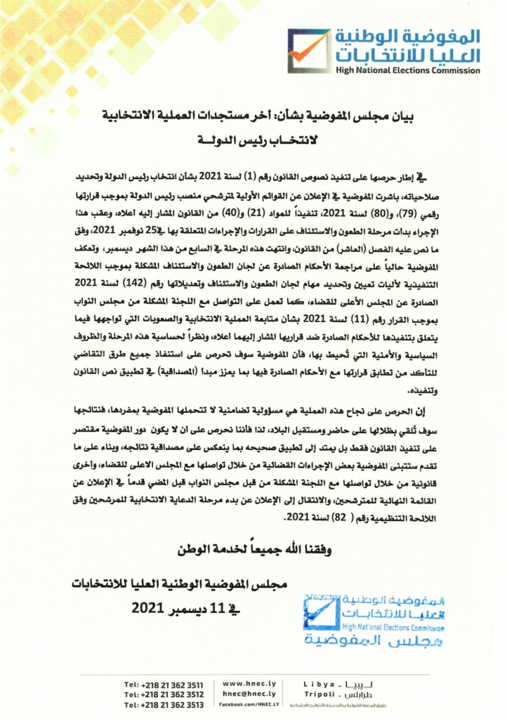 في إطار حرصها على تنفيذ نصوص القانون رقم (1) لسنة 2021 بشأن انتخاب رئيس الدولة وتحديد صلاحياته، باشرت المفوضية في الإعلان عن القوائم الأولية لمترشحي منصب رئيس الدولة بموجب قرارتها رقمي (79)، و(80) لسنة 2021، تنفيذاً للمواد (21) و(40) من القانون المشار إليه أعلاه، وعقب هذا الإجراء بدأت مرحلة الطعون والاستئناف على القرارات والإجراءات المتعلقة بها في25 نوفمبر 2021، وفق ما نص عليه الفصل (العاشر) من القانون، وانتهت هذه المرحلة في السابع من هذا الشهر ديسمبر، وتعكف المفوضية حالياً على مراجعة الأحكام الصادرة عن لجان الطعون والاستئناف المشكلة بموجب اللائحة التنفيذية لأليات تعيين وتحديد مهام لجان الطعون والاستئناف وتعديلاتها رقم (142) لسنة 2021 الصادرة عن المجلس الأعلى للقضاء، كما تعمل على التواصل مع اللجنة المشكلة من مجلس النواب بموجب القرار رقم (11) لسنة 2021 بشأن متابعة العملية الانتخابية والصعوبات التي تواجهها فيما يتعلق بتنفيذها للأحكام الصادرة ضد قراريها المشار إليهما أعلاه، ونظراً لحساسية هذه المرحلة والظروف السياسية والأمنية التي تُحيط بها، فأن المفوضية سوف تحرص على استنفاذ جميع طرق التقاضي للتأكد من تطابق قرارتها مع الأحكام الصادرة فيها بما يعزز مبدأ (المصداقية) في تطبيق نص القانون وتنفيذه.