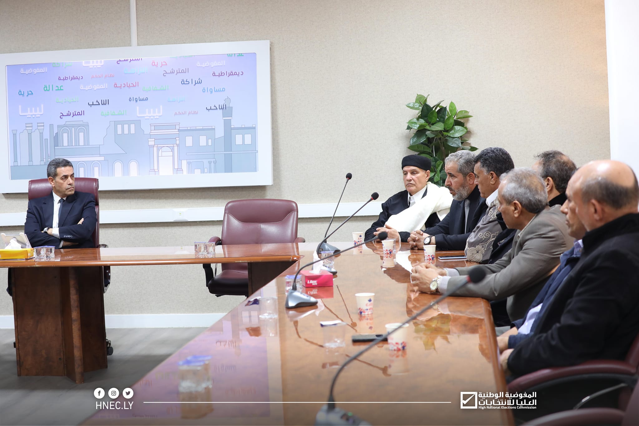 التقى رئيس مجلس المفوضية السيد د. عماد السايح اليوم الخميس 8 فبراير 2024، وفداً ضم عميد وأعيان ومشايخ بلدية ترهونة وذلك بمقر المفوضية.