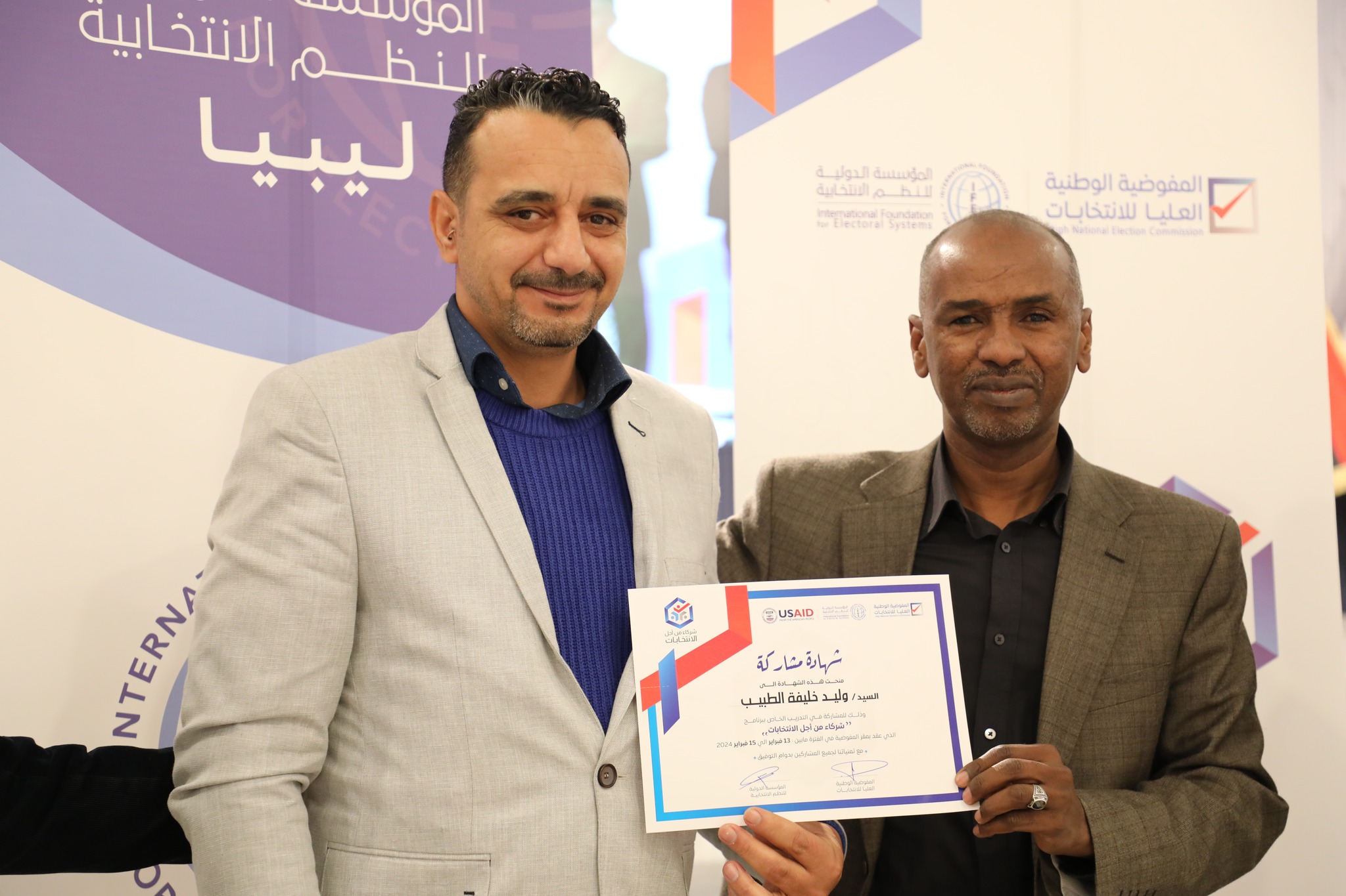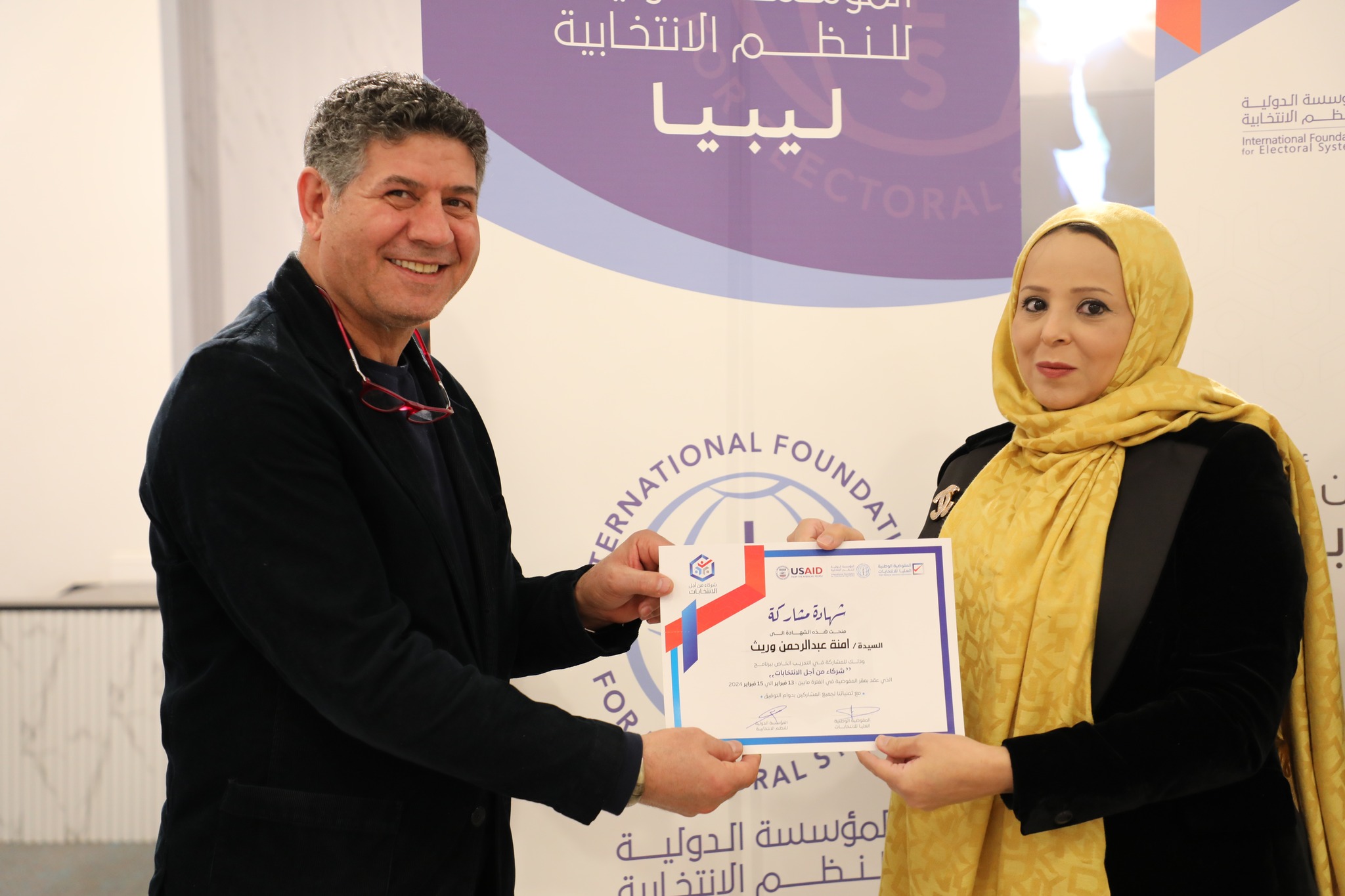 وفـي نهـايـة الـدورة وزعـت شهـادات المشاركة على المتدربين وذلك بحضور كلاً من عضو مجلس المفوضية السيد/ أبوبكر مردة،  ومدير إدارة التوعية والتواصل السيد/ خالد الموسي، ومدير مكتب منظمة ايفس في ليبيا السيد/ عماد يوسف.