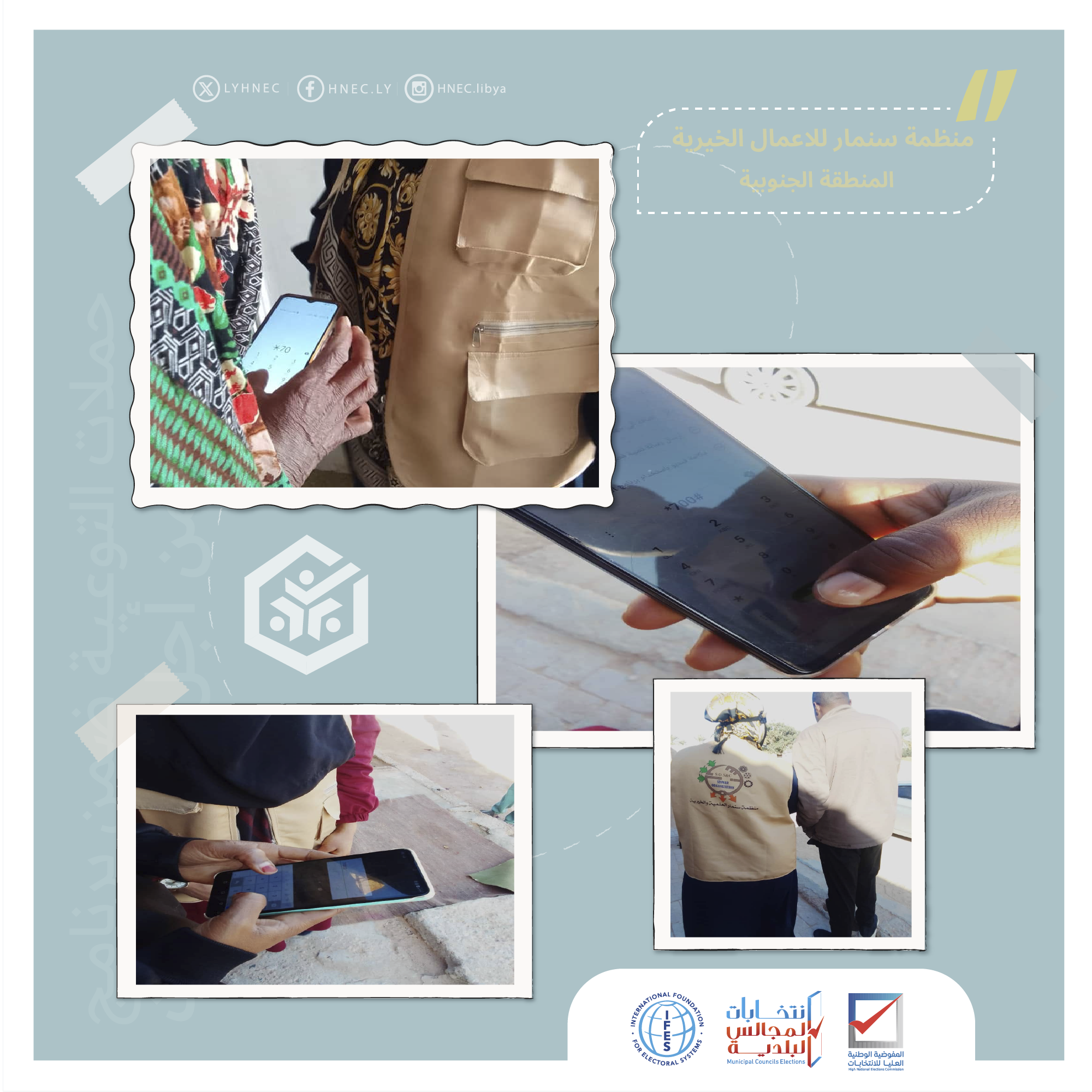 يواصل فريق منظمة سنمار الخيرية للتوعية، الشريك في برنامج (شركاء من اجل الانتخابات ) حملاته التوعوية بأهمية المشاركة في العملية الانتخابية ، حيث تضمنت برامج التوعية التي أعدها الفريق حملة توعوية بعنوان ( طرق الابواب) ، استهدفت الحملة النساء في البيوت وذلك بقيادة رئيسة فريق التوعية بالمنظمة والفريق المصاحب لها ، هدف الحملة هو الوصول إلى كافة النساء وشرائح المجتمع المختلفة للتوعية بأهمية المشاركة و حث المواطنين على ضرورة ربط رقم الهاتف بالرقم الوطني عن طريق الاتصال بالرمز #700* كمرحلة أولى تسبق مرحلة التسجيل .