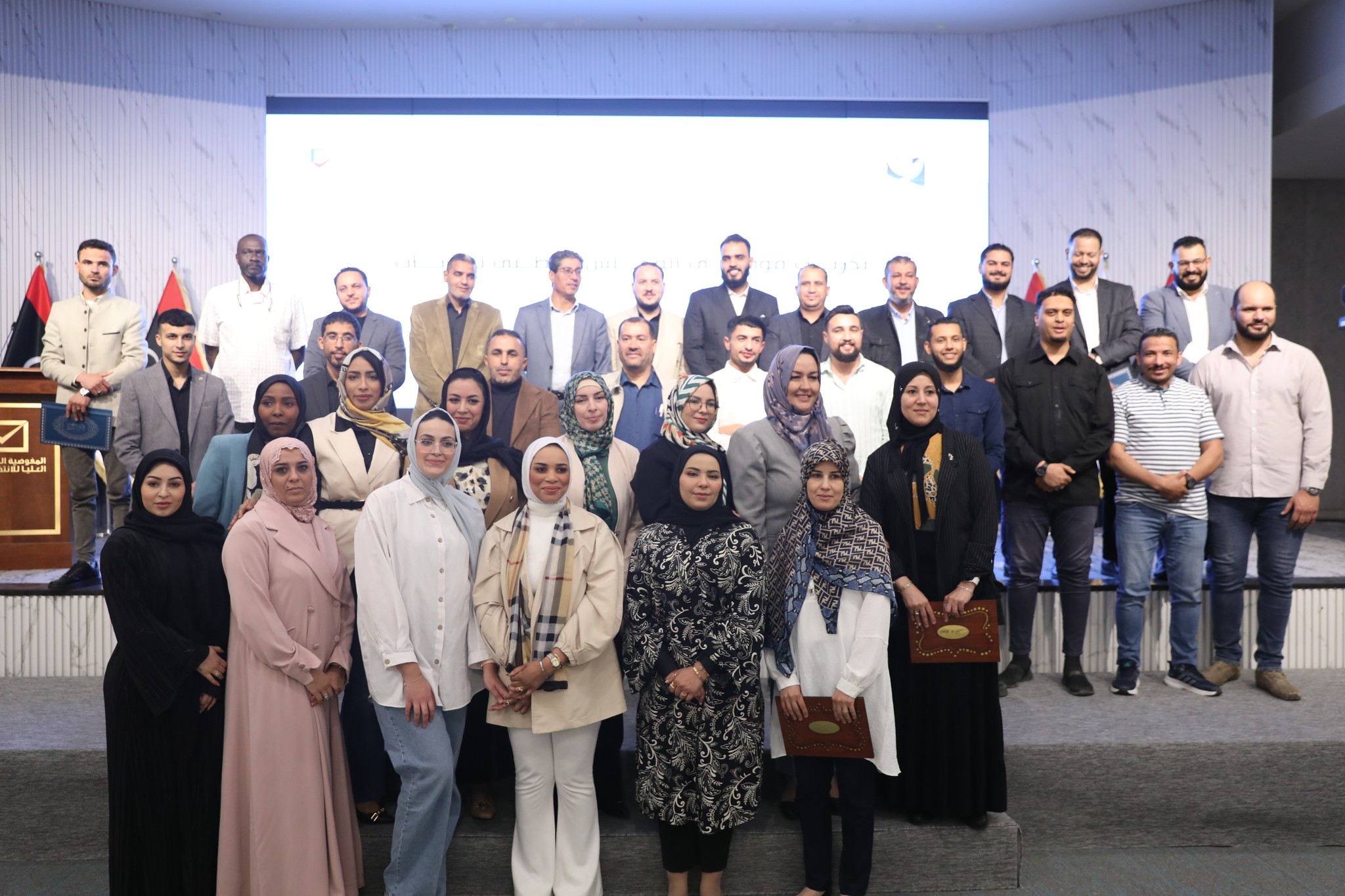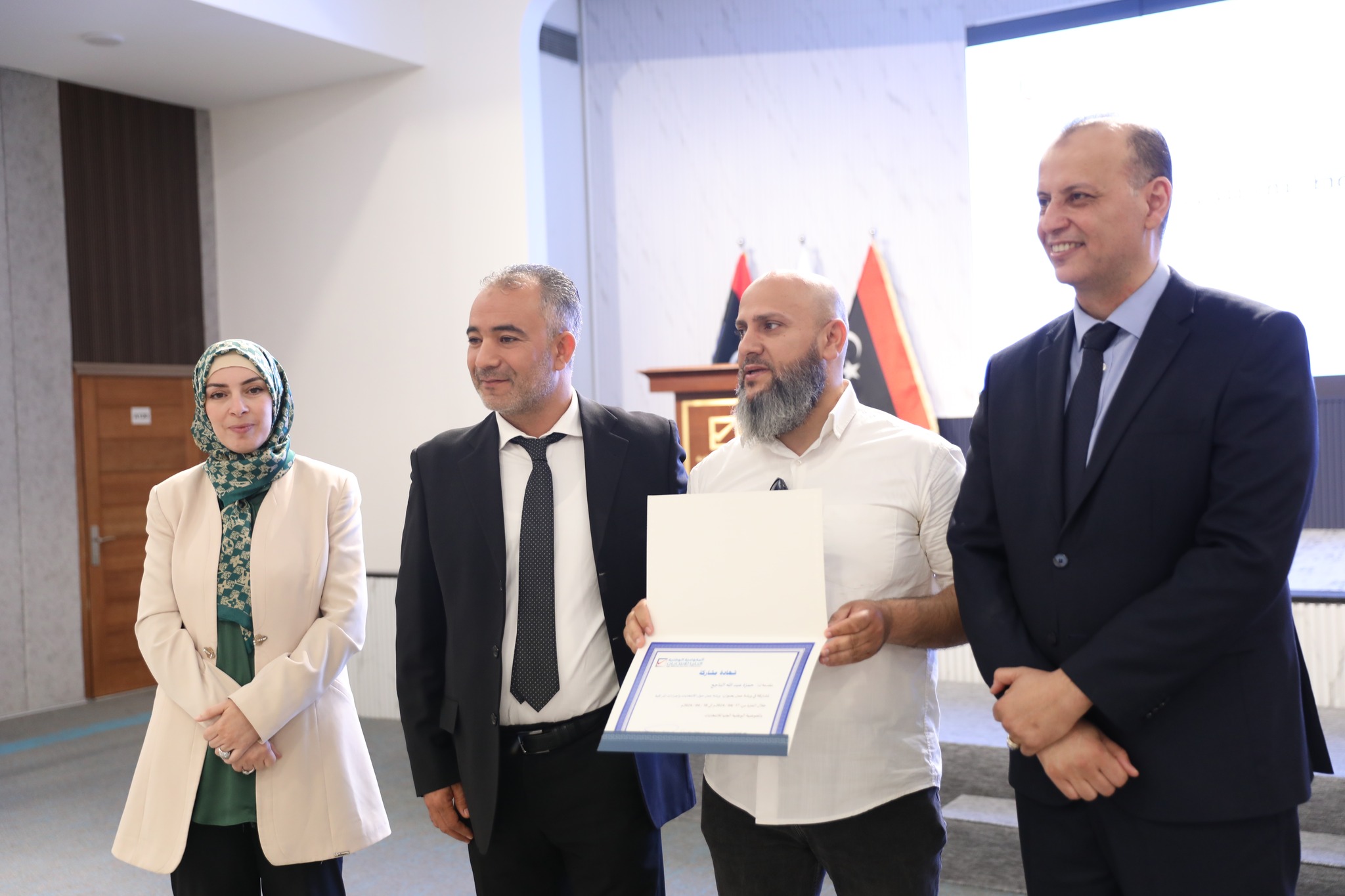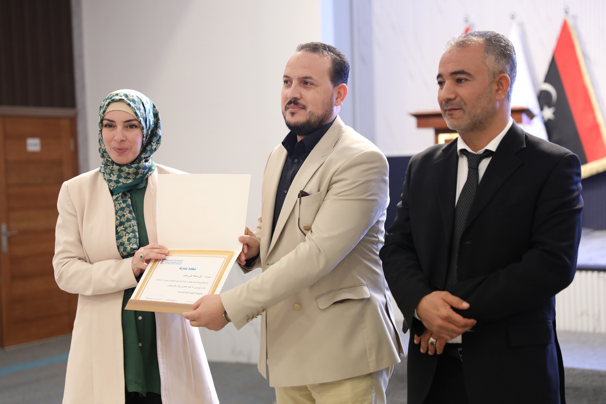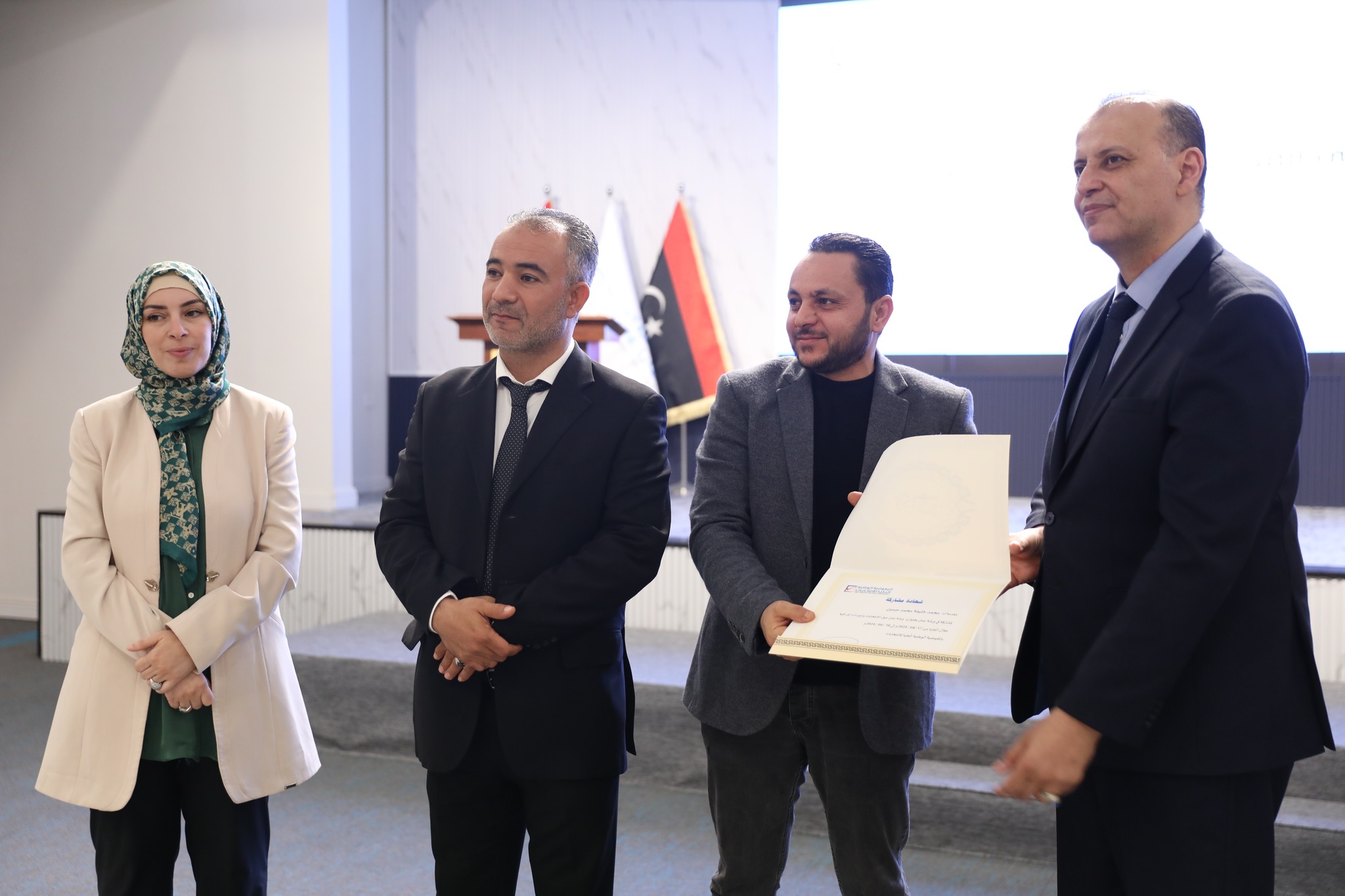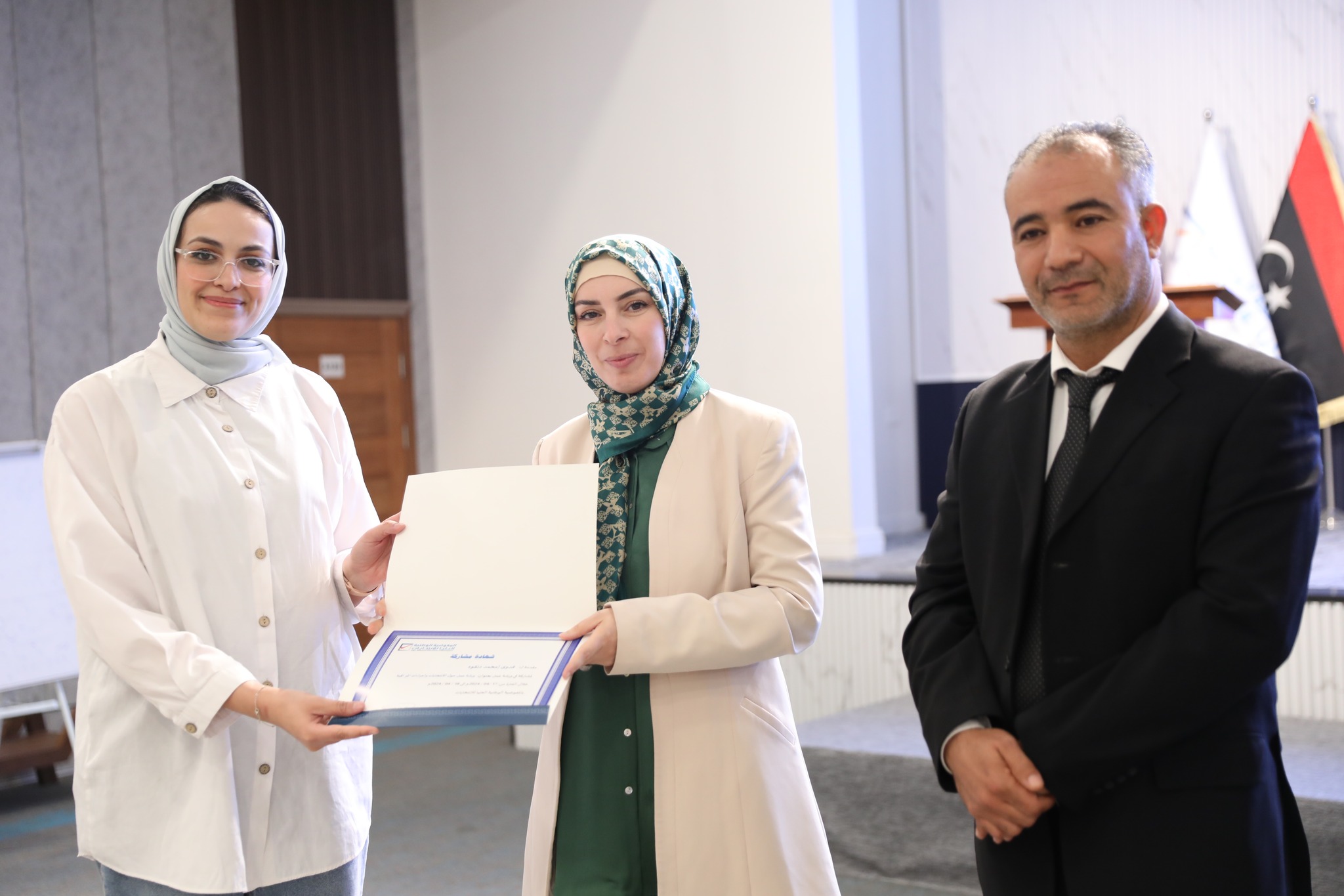 وفـي نهـايـة الـدورة وزعـت شهـادات المشاركة على المشاركين وذلك بحضور كلاً من عضو مجلس المفوضية السيدة/ رباب حلب، ومدير إدارة التسجيل والعمليات الخارجية السيد/ وليد سيالة.