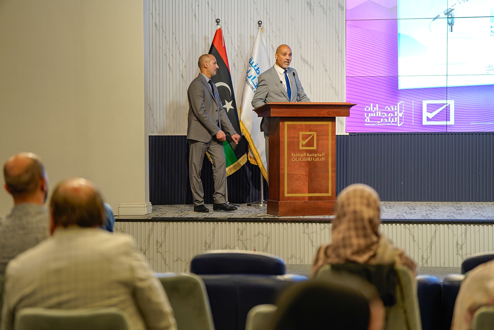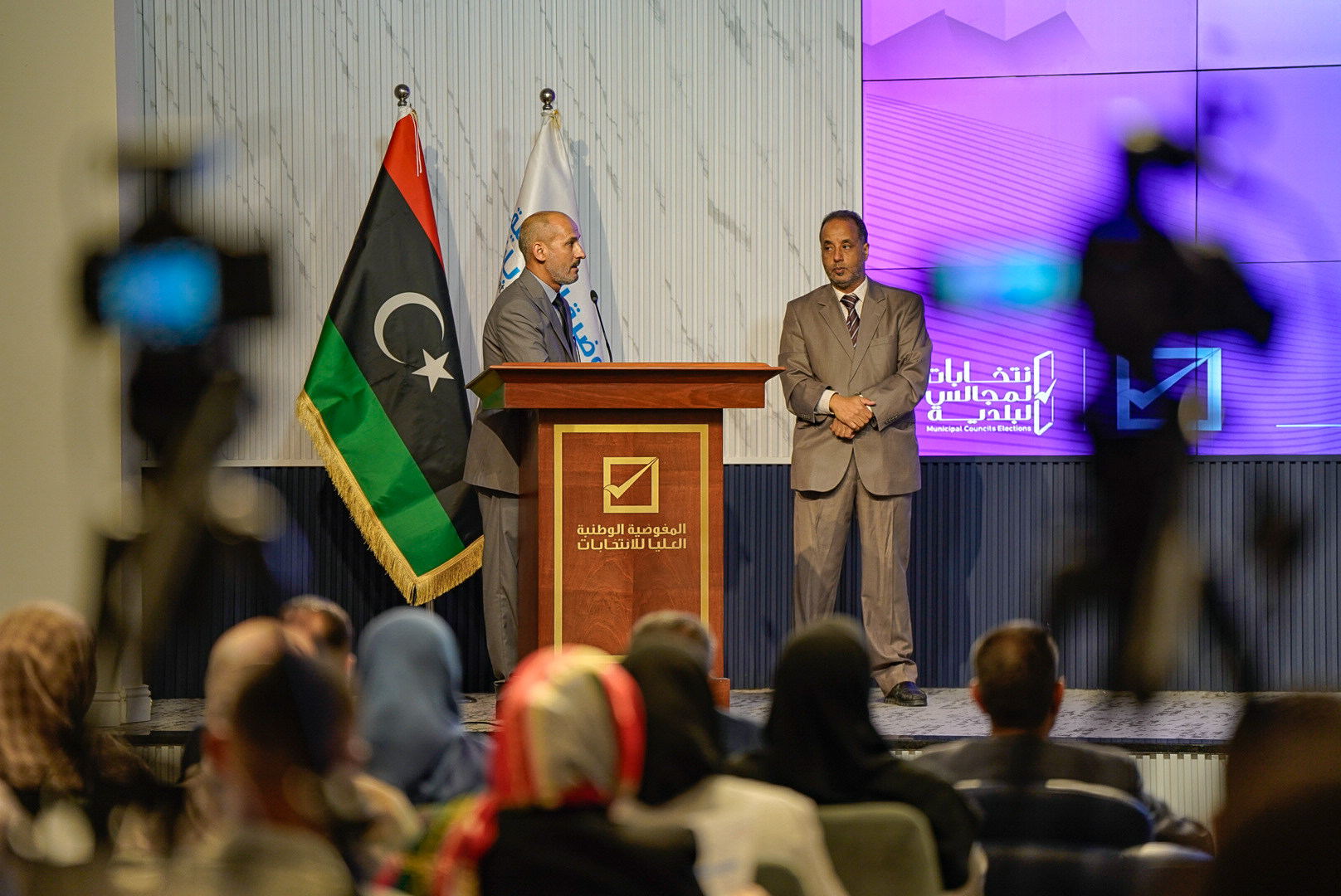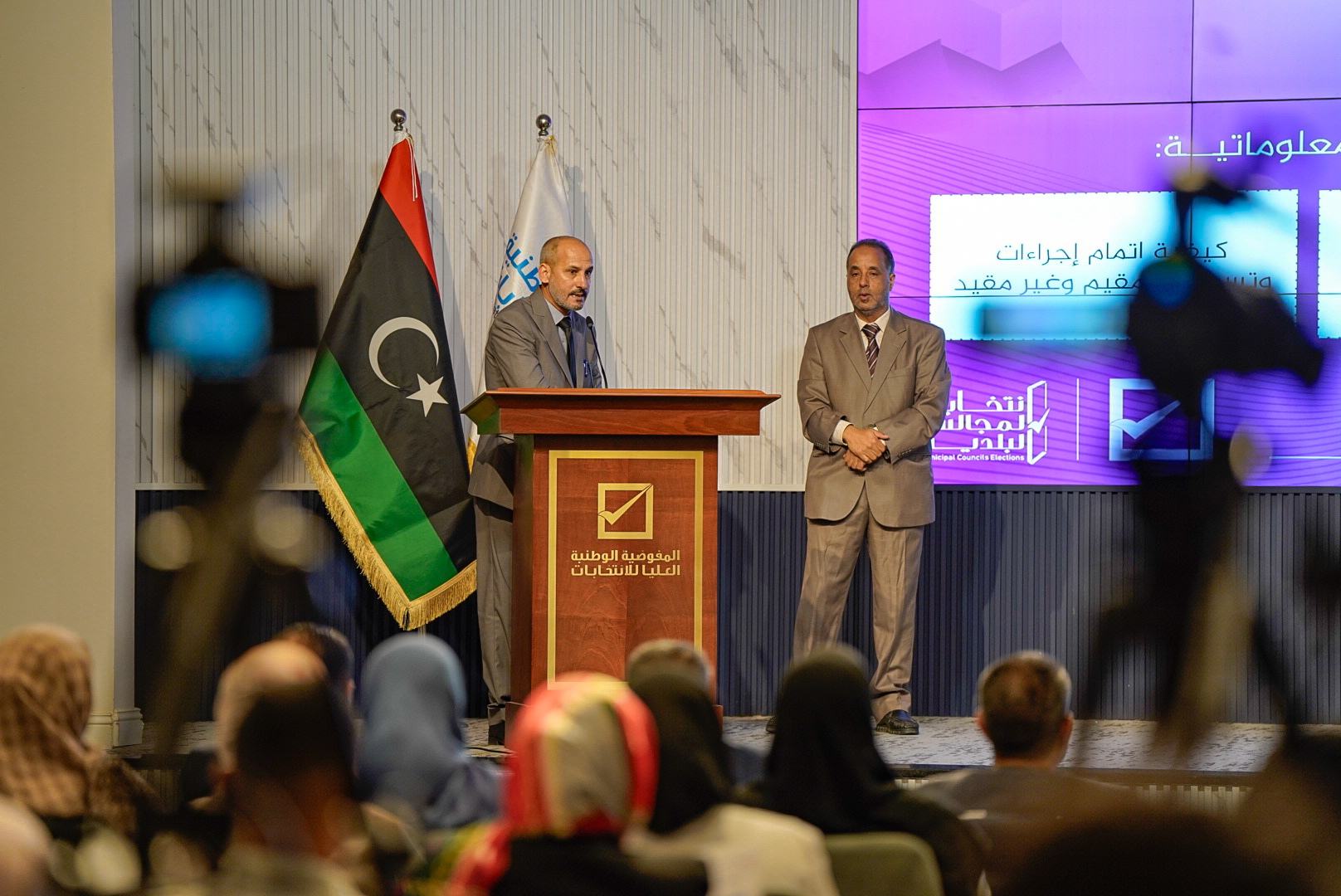أعلنت المفوضية الوطنية العليا للانتخابات عن فتح سجل الناخبين لانتخاب المجالس البلدية في (60) بلدية من البلديات المستهدفة بانتخاب مجالسها، جاء ذلك خلال مؤتمر صحفي عقده رئيس مجلس المفوضية السيد د. عماد السايح اليوم الأحد 9 يونيو 2024م، بحضور أعضاء المجلس، ونائبة المبعوث الخاص للأمين العام للأمم المتحدة ومنسقة الشؤون الإنسانية في ليبيـا السيدة جورجيت غاليون، ووزير التربية والتعليم السيد د. موسى المقريف، ورئيس الهيئة العامة للمعلومات السيد عبد الباسط الباعور، ووكيل وزارة الداخلية لشؤون المديريات اللواء بشير الأمين، ومدير الإدارة العامة للعمليات الأمنية بوزارة الداخلية اللواء علي النويصري، وعدد من ممثلي البعثات الدولية ووسائل الإعلام، وذلك بالمركز الإعلامي بالمفوضية.