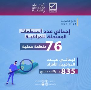 إجمالي عدد المنظمات المسجلة للمراقبة على انتخابات المجالس البلدية (76)منظمة و إجمالي عدد المراقبين الأفراد (835) مراقب.