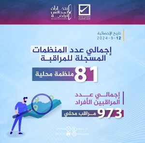 إجمالي عدد المنظمات المسجلة للمراقبة على انتخابات المجالس البلدية (81)منظمة و إجمالي عدد المراقبين الأفراد (973) مراقب.