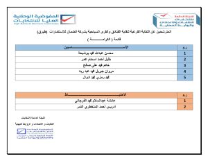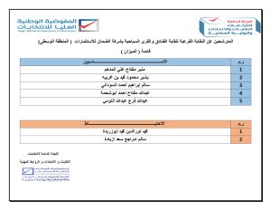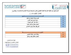 اللجنة الدائمة لانتخابات النقابات والاتحادات والروابط المهنية بالمفوضية الوطنية العليا للانتخابات تعلن عن نشر القوائم الأولية المتقدمة للترشح لانتخاب النقابات الفرعية ( المنطقة الوسطى ـ طبرق – بنغازي) لنقابة الفنادق والقرى السياحية بشركة الضمان للاستثمارات ولمدة (2 يومان ) وذلك للاطلاع وتقديم الطعون بشأنها خلال المدة القانونية المحددة ( 2 يومان من تاريخ النشر )