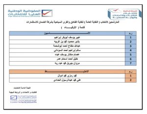 اللجنة الدائمة لانتخابات النقابات والاتحادات والروابط المهنية بالمفوضية الوطنية العليا للانتخابات تعلن عن نشر القائمة الأولية المتقدمة للترشح لانتخاب النقابة العامة للفنادق والقرى السياحية بشركة الضمان للاستثمارات، ولمدة (2 يومان ) وذلك للاطلاع وتقديم الطعون بشأنها إن وجدت خلال المدة القانونية المحددة ( 2 يومان من تاريخ النشر ).