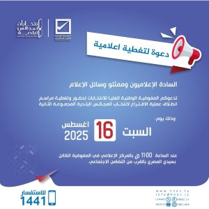 تدعوكم المفوضية الوطنية العليا للانتخابات لحضور وتغطية مراسم انطلاق عملية الاقتراع لانتخاب المجالس البلدية المجموعة الثانية.