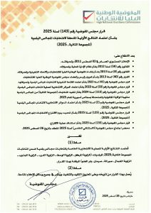 قرار مجلس المفوضية رقم (143) لسنة 2025 بشأن اعتماد النتائج الأولية الملحقة لانتخابات المجالس البلدية (المجموعة الثانية – 2025)