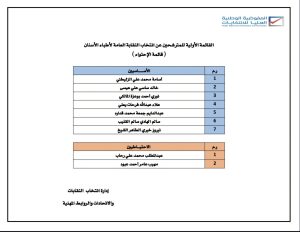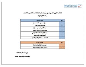 إدارة انتخاب النقابات والاتحادات والروابط المهنية بالمفوضية الوطنية العليا للانتخابات تعلن عن نشر القوائم الأولية المتقدمة للترشح لانتخاب النقابة العامة لأطباء الأسنان ولمدة (2 يومان ) وذلك للاطلاع وتقديم الطعون بشأنها إن وجدت خلال المدة القانونية المحددة ( 2 يومان من تاريخ النشر ).