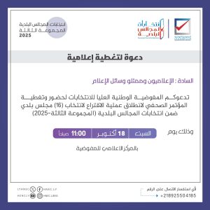 تدعوكم المفوضية الوطنية العليا للانتخابات لحضور وتغطية المؤتمر الصحفي لانطلاق عملية الاقتراع لانتخاب (16) مجلس بلدي ضمن انتخابات المجالس البلدية (المجموعة الثالثة – 2025).