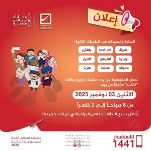السادة والسيدات في البلديات التالية: (طبرق – قصر الجدي – بنغازي – توكرة – قمينس – الأبيار – سلوق – سرت – سبها) تعلن المفوضية عن بدء عملية توزيع بطاقة “ناخب” اعتباراً من يوم الاثنين 03 نوفمبر 2025 من 8 صباحاً إلى 2 ظهراً