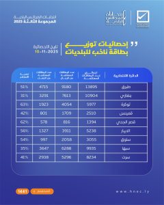 إحصائيات توزيع بطاقة (ناخب) لعدد 9 بلديات تاريخ الإحصائية 2025/11/10
