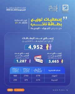إحصائيات توزيع بطاقة (ناخب) في بلديتي #تاجوراء و #الجديدة تاريخ الإحصائية 2025/11/27